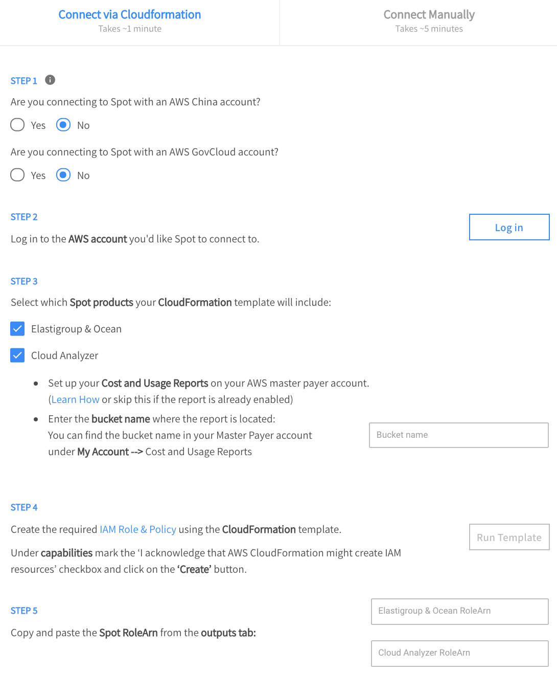 3. Complete the steps as shown in the online form. The example below shows the form for a new Spot customer. If you have already connected Cloud Analyzer or Eco, the form will be shorter than the one below.