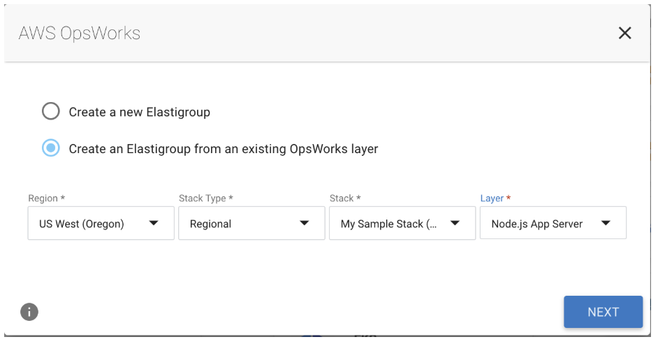 Under Elastigroups, click Create Elastigroup, and choose Opsworks from the use-cases screen.